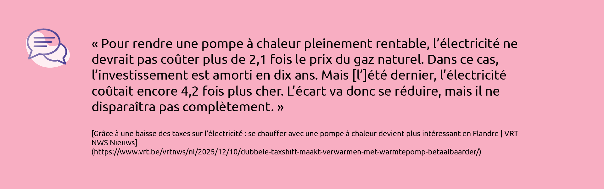 S’ajoute à cela une logique économique qui n’est pas toujours convaincante. Même si des mesures récentes et le contexte géopolitique réduisent l’écart entre le gaz et l’électricité, l’électricité reste aujourd’hui nettement plus chère que le gaz naturel en Belgique. Des analyses montrent que le rapport de prix s’améliore, mais pas encore au point où les pompes à chaleur deviennent naturellement rentables pour tout type de logement.